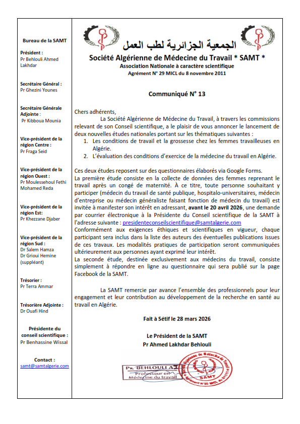 La SAMT lance un appel à ses adhérents disposant de travaux portant sur l’œil et le travail et plus particulièrement la rétine en milieu professionnel. Dans le cadre de la Sixième journée de la Société Algérienne de la Rétine, qui se tiendra les 1 et 2 Avril 2026, la Société Algérienne de la Rétine nous offre exceptionnellement la possibilité de présenter une ou deux communications. Les membres ayant des travaux dans ce domaine sont invités à se manifester dans les plus brefs délais. Merci d’envoyer rapidement vos propositions au conseil scientifique de la SAMT : presidenteconseilscientifique@samtalgerie.com Présidente du conseil scientifique Pr W.BENHASSINE Saha ftourkoum